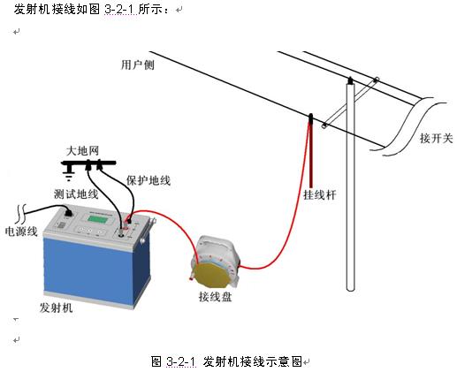 首先將故障線路的開關(guān)斷開;發(fā)射機(jī)電源接220V市電;保護(hù)地線接“保護(hù)地"端子和大地網(wǎng);測試地線(帶黑色夾鉗的高壓導(dǎo)線)接“測試地"插座和大地網(wǎng);至于接故障線路的輸出線,可根據(jù)現(xiàn)場情況,使用短連接線(帶紅色夾鉗的高壓導(dǎo)線)接“線路"端子和開關(guān)柜的線路側(cè),若必須接在架空的線路上,則選用接線盤裝的長連接線,其高壓插頭接“線路"端子,其另一端的線鼻壓接在絕緣掛線桿的接線柱上,再將掛線桿掛在故障線路上。