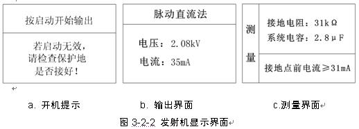 打開電源開關(guān),此時(shí)發(fā)射機(jī)并沒有輸出,“停止"按鈕上的指示燈亮,屏幕顯示如下提示信息“按啟動(dòng)開始輸出,若啟動(dòng)無效,請檢查保護(hù)地是否接好!",如圖3-2-2a所示。