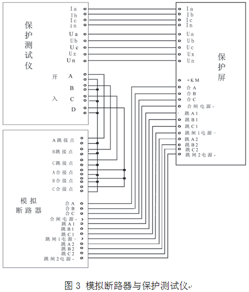 ***斷路器模擬裝置裝置與測試儀及保護(hù)裝置相配合使用,替代實(shí)際斷路器,可以進(jìn)行保護(hù)裝置動(dòng)作跳合斷路器的整組傳動(dòng)試驗(yàn),請參見圖3。