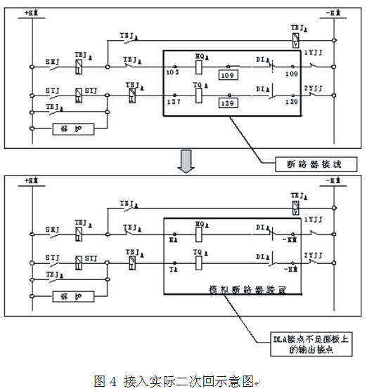 在保護(hù)裝置的測試過程中,斷路器模擬裝置裝置在二次回路中的接線方法是將實(shí)際斷路器的跳、合閘線圈的接線從二次回路中退出,將斷路器模擬裝置裝置的A、B、C的跳、合閘線圈對(duì)應(yīng)地接入二次回路中,與保護(hù)和測試儀配合,完成保護(hù)裝置的整組測試(如圖4,只以A相單組跳閘跳圈為例)。