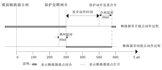 動(dòng)作過程的坐標(biāo)圖是合閘和跳閘及重合閘動(dòng)作的全過程。當(dāng)斷路器模擬裝置接到合閘命令時(shí),經(jīng)過80ms合閘時(shí)間延時(shí),斷路器模擬裝置合上,斷路器模擬裝置輔助繼電器常開接點(diǎn)閉合,常閉接點(diǎn)打開;同理,斷路器模擬裝置接到跳閘命令時(shí),經(jīng)過40ms跳閘時(shí)間延時(shí)后,
